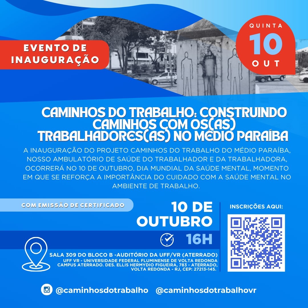 Em celebração ao Dia Mundial da Saúde Mental, a Universidade Federal Fluminense (UFF) inaugura o projeto “Caminhos do Trabalho”, no dia 10 de outubro, às 16h, no campi de Volta Redonda. O serviço é gratuito e oferece assistência médico ocupacional, jurídico trabalhista e previdenciário e psicológico a trabalhadores formais ou informais, residentes do município de Volta Redonda (RJ) e da região Sul Fluminense, vítimas de agravos e adoecimentos relacionados ao trabalho, com o objetivo de mapear e combater a ocultação e subnotificação dos acidentes e adoecimentos ocupacionais no Brasil.